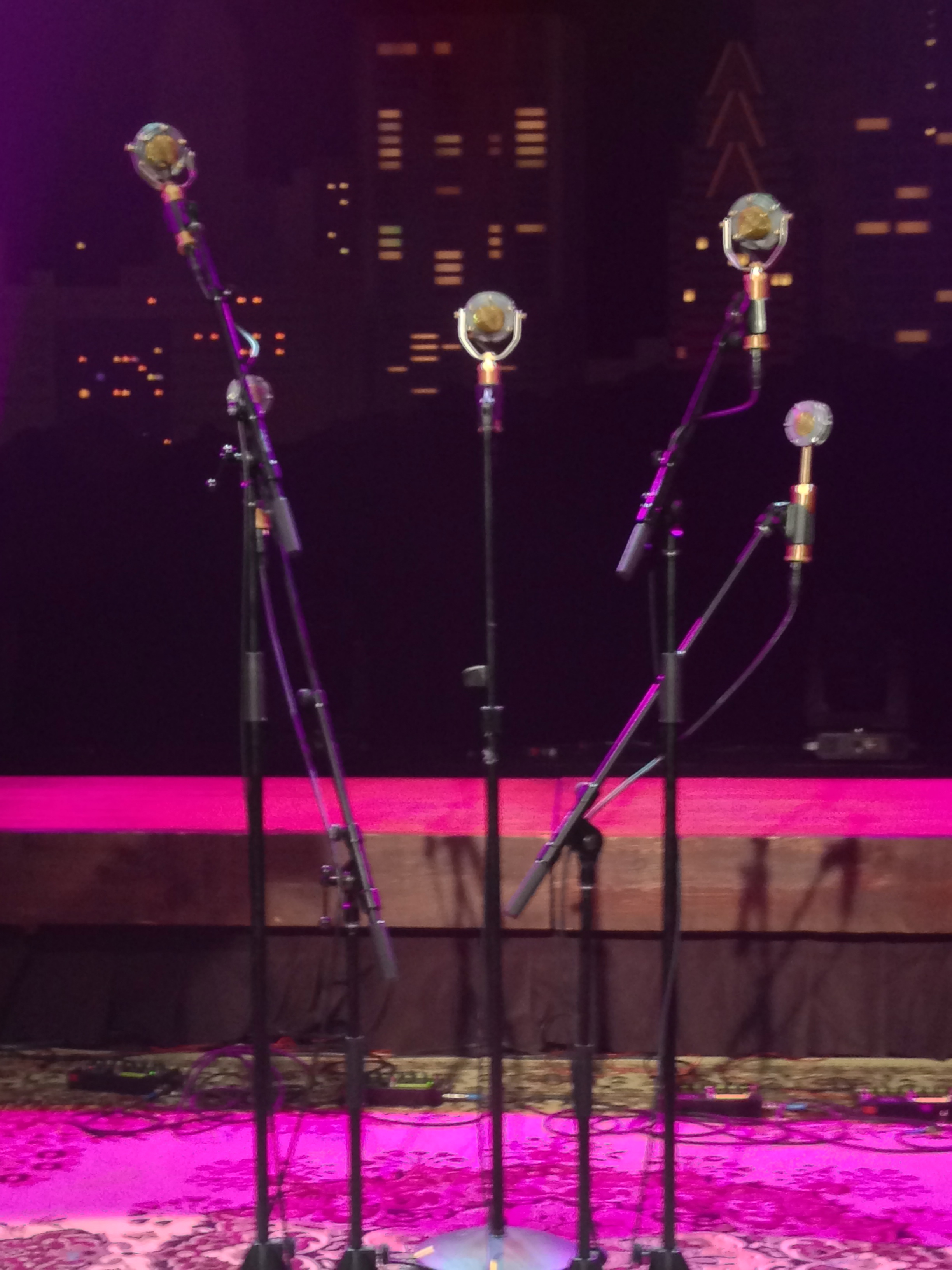Hailing from Eagle Rock, California, Kenneth Pattengale and Joey Ryan formed, The Milk Carton Kids in 2011 – after years of paying dues as solo artists, they were hailed as an overnight sensations as a duo. Whereas Ms. Jarosz and company avail themselves of a more modern technology to amplify their acoustic instruments, Ryan and Pattengale go the old-fashioned route and use microphones exclusively to project the sound of their voices and instruments. For the taping, MCK brought their own preferred setup of Ear Trumpet Lab microphones. Below you’ll see a couple of pictures of a far more complicated set-up than what was used at the actual taping. For the recorded show, “the less is more” approach was decided and a single microphone was used. Though one microphone makes life simpler (or probably more complicated) for the sound guys, it necessitates a more dynamic approach to performing for Kenneth and Joey, meaning they have to physically move toward and away from the microphone as their musical parts dictate. That’s quite an accomplishment of technique that is rarely seen these days.