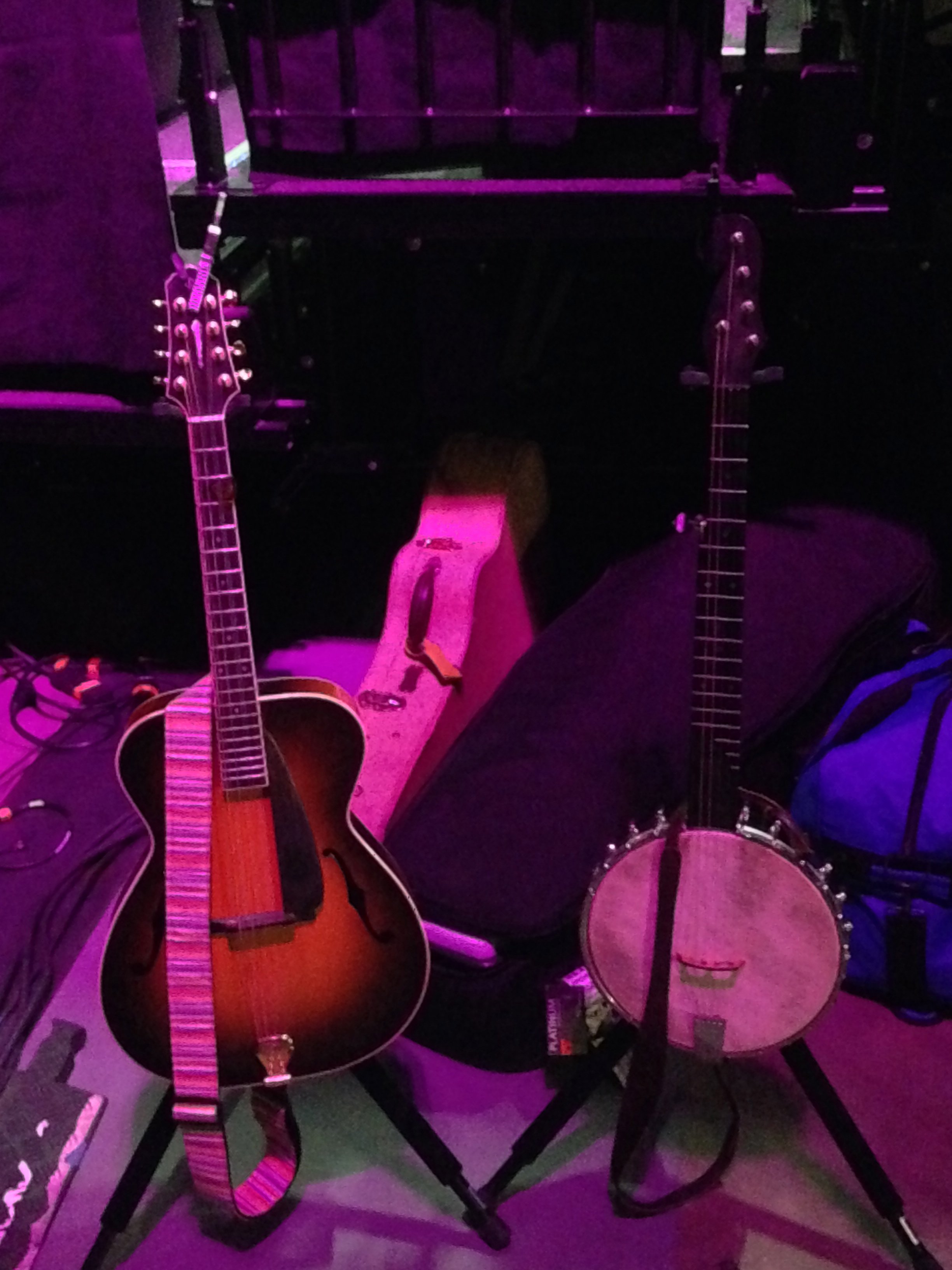 Sarah also brought what looks like a custom built “Burning Sun” banjo built by Blanco, Texas piano restorer Bernard Mollberg. The esoteric instrument to the right is an octave mandolin crafted by Fletcher Brock of Seattle, Washington.