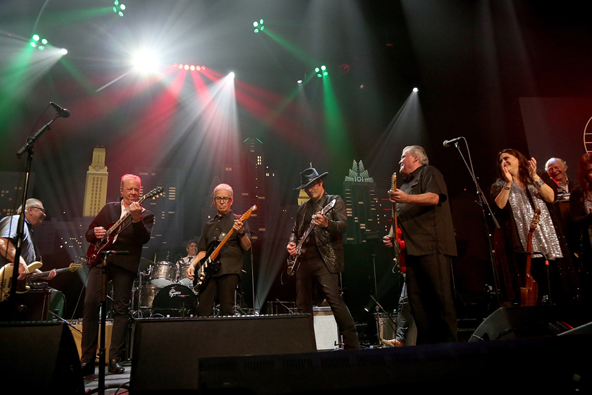 Following an intermission, Isaak returned to introduce the night’s final honoree: one of America’s greatest, most versatile rock & roll bands, Los Lobos. Austin filmmaker Robert Rodriguez inducted the band, telling the story of how they scored his movie Desperado. Accepting the award, David Hidalgo talked about how the Austin musical royalty of the early eighties welcomed them to town. Then it was time for Los Lobos to do what it does best, as they picked up their instruments and launched right into “Will the Wolf Survive,” the song that took the rock underground by storm in 1984. Steel guitar master Robert Randolph then came on stage for “Don’t Worry Baby,” the blazing blues rocker that opens Lobos’ first album and a standard of their shows since. The band donned acoustic instruments for one of their catalog highlights – the title track of La Pistola y El Corazón, the group’s tribute to its Mexican-American roots. Then came what may have been a surprise to Los Lobos’ fanbase, as singer/songwriter Boz Scaggs arrived to join the band to add vocals and guitar to “Hearts of Stone,” a groovy, soulful Lobos classic.