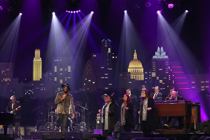 Two of Austin’s own rounded out the tribute. Equally genre-agnostic singer and songwriter Ruthie Foster put her remarkable voice to the service of “Georgia On My Mind,” Hoagy Carmichael’s immortal standard that will forever be associated with Charles – though Foster’s gospel-influenced reading gave the master a run for his money. Foster remained onstage, joined by Carolyn Wonderland and Shelley King, to back up blues rock star Gary Clark Jr., eschewing his trademark guitar slinging for a swaggering take on the sizzling “(Night Time is) the Right Time.” Isaak returned to praise house band director Lloyd Maines, who introduced the ACL All-Stars: guitarist David Grissom, organist Red Young, hornmen John Mills, Jon Blondell, Eric Burnheart and Adrian Ruiz, bassist Bill Whitbeck and drummer Tom Van Schaik.